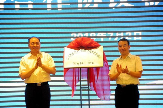 孙爱武和施恩佩为“江苏省淮阴工学院联合技术转移中心淮安区分中心”揭牌 韩同友主持签约仪式。